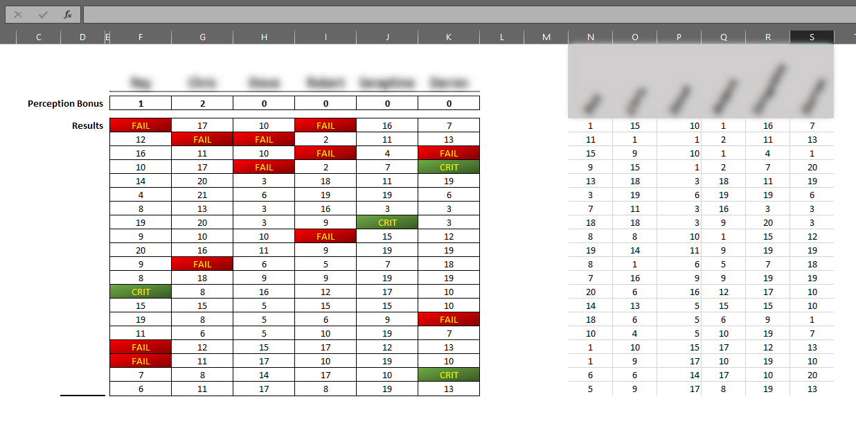 In the right hand side I put their raw rolls. Then I have Perception Bonus under the character name and above the results. The cells underneath then add them up, and the fields under the name are updated with the latest results. The table also checks the RAW rolls, to determine critical rolls. See below for how it looks when it is setup ready to go.